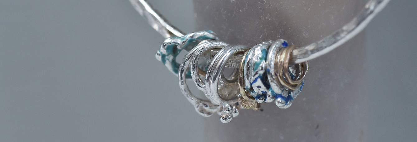 Handmade layered Bracelets mixing Gold, Silver, Enamel, Text and Motifs